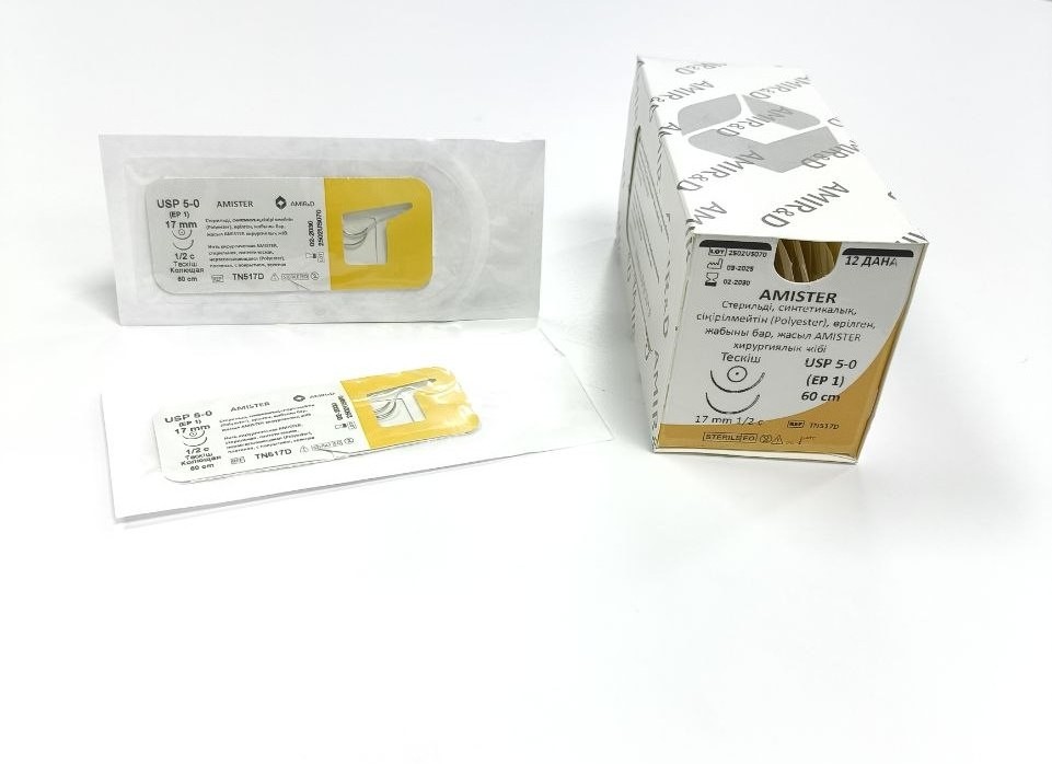 Шовный материал «Нить хирургическая AMISTER, стерильная, синтетическая, нерассасывающаяся (Polyester), плетеная, с покрытием, зеленая или неокрашенная, с атравматическими иглами различных типов и форм и без игл, размерами USP (метрический): 6-0 (0,7), 5-0 (1), 4-0 (1,5), 3-0 (2), 2-0 (3), 0 (3,5), 1 (4), 2 (5), 3-4 (6), 5 (7), 6 (8); длина нити: от 10 см – 20 метров; длина игл: от 3,8 – 110 мм» представляет собой стерильный синтетический нерассасывающийся плетеный хирургический шовный материал однократного применения на основе полиэстера с полибутилатным покрытием, которое придает ему гладкость и облегчает проникновение в ткани, а также облегчает работу с шовным материалом. Шовный материал AMISTER характеризуется отличными физико-механическими и манипуляционными свойствами, вызывает незначительную тканевую реакцию. Доступны варианты исполнения как в окрашенном (зеленый краситель D & C - №6, номер цветового кода 61565), так и не в окрашенном виде. Шовный материал поставляется отдельно или в комбинации с атравматическими иглами со специальным покрытием, различной твердости и параметрами шероховатости поверхности игл, различных типов (заточка острия иглы, степень изогнутости, профиль сечения, тип ушка иглы и другие), форм и размеров, с определенными наружными диаметрами. Шовный материал AMISTER соответствует требованиям СТ ТОО-262 (ТОО «Амир и Д»), Европейской фармакопеи (ЕФ) для стерильных шовных материалов из полиэтилентерефталата и Фармакопеи Соединенных Штатов Америки (ФСША) для нерассасывающихся хирургических шовных материалов из полиэтилентерефталата, за исключением небольшого превышения диаметра для некоторых типов шовного материала.
