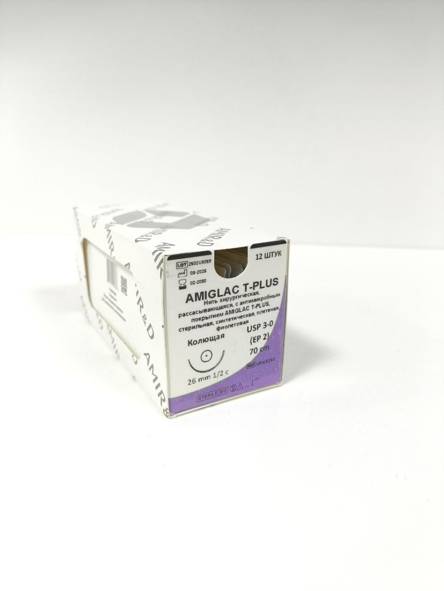 Шовный материал «Нить хирургическая, рассасывающаяся, с антимикробным покрытием AMIGLAC T-PLUS, стерильная, синтетическая, плетеная, фиолетовая или неокрашенная, с атравматическими иглами различных типов и форм и без игл, размерами USP (метрический): №10-0 (0,2), 9-0 (0,3), 8-0 (0,4), 7-0 (0,5), 6-0 (0,7), 5-0 (1), 4-0 (1,5), 3-0 (2), 2-0 (3), 0 (3,5), 1 (4), 2 (5), длина нити: от 10 см – 20 метров; длина игл: от 3,8 – 110 мм» представляет собой стерильный синтетический рассасывающийся плетёный хирургический шовный материал с антимикробным покрытием, однократного применения на основе полиглактина 910, сополимера, состоящего из 90 % гликолида и 10 % L-лактида. Шовный материал AMIGLAC T-PLUS покрыт смесью, состоящей из равных частей сополимера гликолида и лактида (Полиглактин 370) и стеарата кальция. Показано, что сополимер полиглактин 910 и полиглактин 370 со стеаратом кальция не имеют антигенной активности, апирогенны и вызывают лишь незначительную реакцию тканей во время рассасывания. Шовный материал содержит «Триклозан», антибактериальное средство широкого спектра действия. Доступны варианты исполнения как в окрашенном (фиолетовый краситель D & C - №2, номер цветового кода 60725), так и не в окрашенном виде. Шовный материал поставляется отдельно или в комбинации с атравматическими иглами со специальным покрытием, различной твердости и параметрами шероховатости поверхности игл, различных типов (заточка острия иглы, степень изогнутости, профиль сечения, тип ушка иглы и другие), форм и размеров, с определенными наружными диаметрами. Шовный материал AMIGLAC T-PLUS с антимикробным покрытием соответствует требованиям СТ ТОО-262 (ТОО «Амир и Д»), Европейской фармакопеи (ЕФ) для стерильных синтетических рассасывающихся плетеных шовных материалов и Фармакопеи США (ФСША) для рассасывающихся хирургических шовных материалов, за исключением небольшого превышения диаметра для некоторых типов шовного материала.