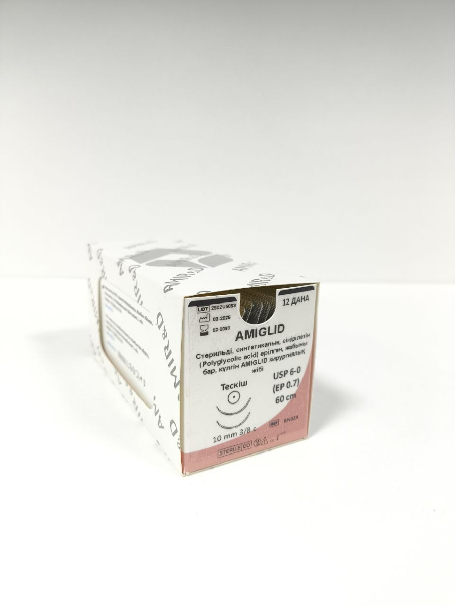 Шовный материал «Нить хирургическая AMIGLID, стерильная, синтетическая, рассасывающаяся (Polyglycolic acid), плетеная, с покрытием, фиолетовая или неокрашенная, с атравматическими иглами различных типов и форм и без игл, размерами USP (метрический): 8-0 (0,4), 7-0 (0,5), 6-0 (0,7), 5-0 (1), 4-0 (1,5), 3-0 (2), 2-0 (3), 0 (3,5), 1 (4), 2 (5); длина нити: от 10 см – 20 метров; длина игл: от 3,8 – 110 мм» представляет собой стерильный синтетический рассасывающийся плетеный хирургический шовный материал однократного применения, изготовленный из полигликолевой (полигидроксиацетиловой) кислоты, покрытие состоит из лактида, гликолида и стеарата кальция. Показано, что для полигликолевой кислоты характерна особая атравматичность поверхности и надежность. Доступны варианты исполнения как в окрашенном (фиолетовый краситель D & C - №2, номер цветового кода 60725), так и не в окрашенном виде. Шовный материал поставляется отдельно или в комбинации с атравматическими иглами со специальным покрытием, различной твердости и параметрами шероховатости поверхности игл, различных типов (заточка острия иглы, степень изогнутости, профиль сечения, тип ушка иглы и другие), форм и размеров, с определенными наружными диаметрами. Шовный материал AMIGLID соответствует требованиям СТ ТОО-262 (ТОО «Амир и Д»), Европейской фармакопеи (ЕФ) для стерильных синтетических рассасывающихся плетеных шовных материалов и Фармакопеи США (ФСША) для рассасывающихся хирургических шовных материалов, за исключением небольшого превышения диаметра для некоторых типов шовного материала.