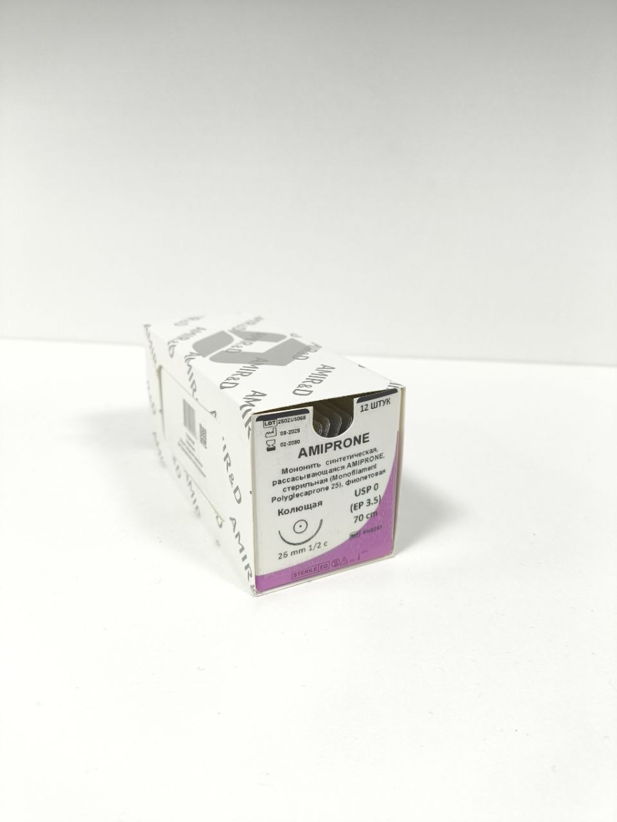 Шовный материал «Мононить синтетическая, рассасывающаяся AMIPRONE, стерильная (Monofilament Polyglecaprone 25), фиолетовая или неокрашенная, с атравматическими иглами различных типов и форм и без игл, размерами USP (метрический): 6-0 (0,7), 5-0 (1), 4-0 (1,5), 3-0 (2), 2-0 (3), 0 (3,5), 1 (4), 2 (5); длина нити: от 10 см – 20 метров; длина игл: от 3,8 – 110 мм» представляет собой стерильный синтетический рассасывающийся монофиламентный хирургический шовный материал однократного применения, изготовленный из сополимера гликолида и эпсилон-капролактона. Показано, что сополимер полиглекапрон-25 не имеет антигенной активности, лишен пирогенных свойств и вызывает лишь незначительную реакцию тканей во время рассасывания. Доступны варианты исполнения как в окрашенном (фиолетовый краситель D & C - №2, номер цветового кода 60725), так и не в окрашенном виде. Шовный материал поставляется отдельно или в комбинации с атравматическими иглами со специальным покрытием, различной твердости и параметрами шероховатости поверхности игл, различных типов (заточка острия иглы, степень изогнутости, профиль сечения, тип ушка иглы и другие), форм и размеров, с определенными наружными диаметрами. Шовный материал AMIPRONE соответствует требованиям СТ ТОО-262 (ТОО «Амир и Д»), Европейской фармакопеи (ЕФ) для стерильных синтетических рассасывающихся монофиламентных шовных материалов и Фармакопеи США (ФСША) для рассасывающихся хирургических шовных материалов, за исключением небольшого превышения диаметра для некоторых типов шовного материала.